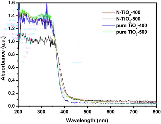 UV–vis absorption spectra of pure TiO2 and N-TiO2 with different calcination temperatures.