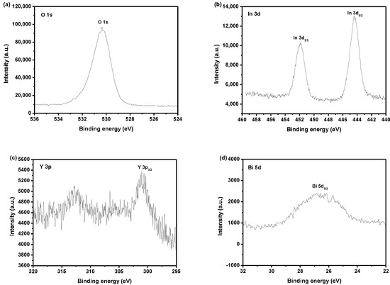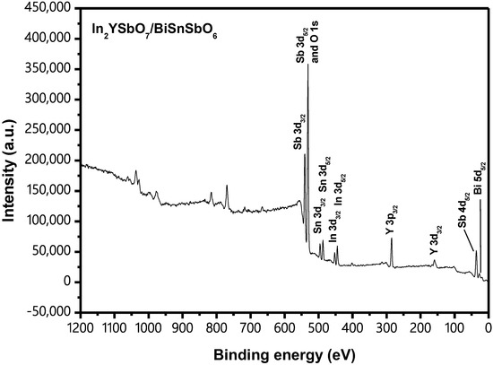 Figure 10 shows the X-ray photoelectron spectroscopy (XPS) survey spectrum of IBHP. Figure 11 shows the XPS spectra of O2−, In3+, Y3+, Bi3+, Sn4+ and Sb5+, which derive from IBHP. According to the XPS survey spectrum, the synthetical IBHP comprised the elements of In, Y, Sb, Bi, Sn and O. On the basis of XPS research results, which were shown in Figure 10 and Figure 11, the oxidation state of In, Y, Sb, Bi, Sn and O ions was +3, +3, +5, +3, +4 and −2, respectively. On the basis of research results, the chemical formula of the new sample could be concluded as In2YSbO7/BiSnSbO6. In Figure 11, the O1s peak of O was situated at 530.35 eV. In3d3/2 and In3d5/2 peaks of In were situated at 451.9 eV and 444.4 eV, respectively. The Y3p3/2 peak of Y was situated at 301.05 eV. The position of the Bi5d5/2 peak of Bi was situated at 26.85 eV. Sn3d3/2 and Sn3d5/2 peaks of Sn were situated at 494.95 eV and 486.45 eV. The Sb4d5/2 peak of Sb was 35.35 eV. The results of surface elemental analysis showed that the average atomic ratio In:Y:Sb:Bi:Sn:O was 382:193:379:179:186:3681. The atomic ratio of In:Y and Bi:Sn in the sample of IBHP was 1.98:1 and 0.96:1, respectively. The reason that the oxygen value was higher might be due to the large amount of oxygen adsorption on the surface of IBHP. Obviously, the XPS peaks of IBHP did not have shoulder and broadening, which meant that there were no other phases within IBHP.