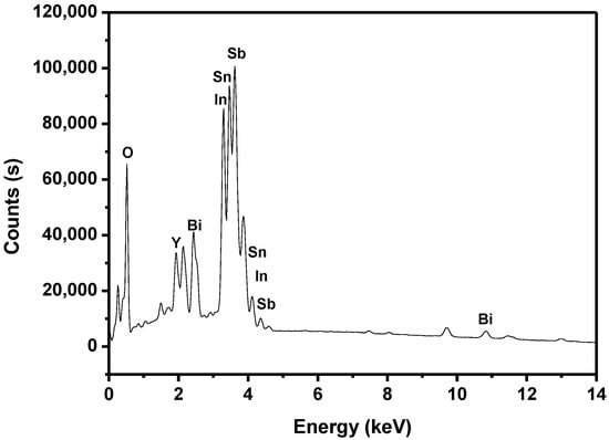 The SEM–EDS results shown in Figure 12, Figure 13 and Figure 14 express that there were no other doped elements in the IBHP compound. Meanwhile, the pure phase of In2YSbO7 was unanimous with the XRD analysis results, as shown in Figure 1. On the basis of Figure 14, the atomic ratio of In:Y:Sb:Bi:Sn:O was 802:397:905:504:5.12:6880. Above results were unanimous with XPS results of IBHP, which are expressed in Figure 10 and Figure 11. The atomic ratio of In2YSbO7:BiSnSbO6 was close to 397:512. According to the above results, under our preparation conditions, we could conclude that IBHP possesses high purity.