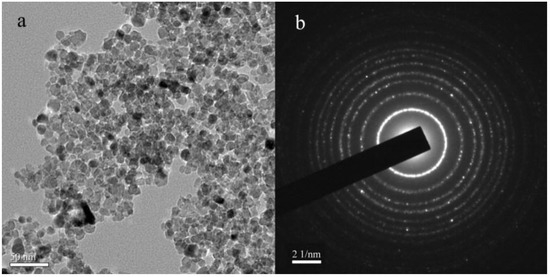 Figure 15 displays the TEM morphology image and the selected-area electron diffraction (SAED) of N-TiO2. Figure 15 shows that the mean diameter size of the particles of N-TiO2 was 10 nm. The limitation of the SAED region was 50 nm; thus, the SAED image of N-TiO2 particles is shown as a concentric circle.