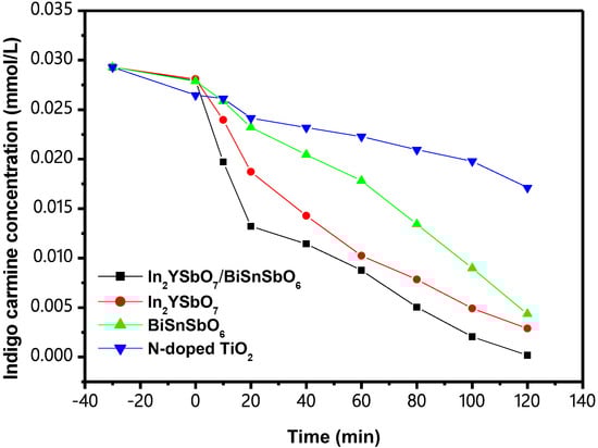 Figure 16 shows the concentration change curve (CCC) of IC during photocatalytic degradation (PCD) with IBHP or In2YSbO7, BiSnSbO6 or N-TiO2 as a catalyst, respectively, under VLGI. In the process of degradation, the concentration of IC in DW gradually decreased with increasing VLGI time. Analysis of the results in Figure 16 showed that the removal rate (ROR) of IC in DW reached 99.42% with a reaction rate of 4.046 × 10−9 mol·L−1·s−1 and the photonic efficiency (PEY) was 0.085% with IBHP after visible-light irradiation of 120 min (VLGI-120M). Other experiments followed the same VLGI time. When we used In2YSbO7 as a catalyst, the ROR of IC reached 90.14% and the rate of reaction was 3.668 × 10−9 mol·L−1·s−1 and the PEY was 0.077% after VLGI-120M. The ROR of IC within DW reached 85.18% and the rate of reaction was 3.467 × 10−9 mol·L−1·s−1 and the PEY was 0.073% with BiSnSbO6 as a catalyst after VLGI-120M. Moreover, the ROR of IC reached 41.57% and the rate of reaction was 1.692 × 10−9 mol·L−1·s−1 and the PEY was 0.036% with N-TiO2 as a catalyst after VLGI-120M. In addition, we could summarize from the analysis of the results that the photodegradation efficiency (PDE) of IC in the case of using IBHP was the best; the PDE of IC with In2YSbO7 as a catalyst was better than that with BiSnSbO6 as a catalyst or with N-TiO2 as a catalyst. The results show that the photocatalytic activity of IBHP under VLGI was the highest compared with In2YSbO7, BiSnSbO6 and N-TiO2. Above results indicate that after VLGI-120M, the ROR of IC, which was degraded with IBHP as a catalyst, was 1.103 times, 1.167 times and 2.392 times higher than that with In2YSbO7, BiSnSbO6 and N-TiO2 as a catalyst, respectively.