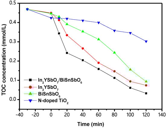 Figure 17 shows the CCC of total organic carbon (TOC) at the time of PCD of IC in DW with IBH as a catalyst or with In2YSbO7 as a catalyst or with BiSnSbO6 as a catalyst or with N-TiO2 as a catalyst under VLGI. Figure 17 shows that the ROR of TOC within DW reached 93.10%, 84.26%, 80.02% and 35.50%, respectively, after VLGI-120M when IBHP, In2YSbO7, BiSnSbO6 and N-TiO2 were used for degrading IC. Finally, by analyzing the results regarding the ROR of TOC at the time of IC degradation, the ROR of TOC with IBHP was the best among the above four catalysts. The obtained results also showed that the ROR of TOC during IC degradation using In2YSbO7 was much higher than that using BiSnSbO6 or N-TiO2, implying that IBHP possessed the highest mineralization rate during IC degradation compared with In2YSbO7 or BiSnSbO6 or N-TiO2.