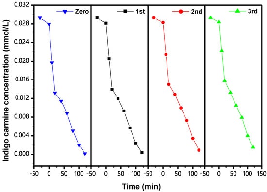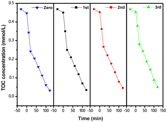 Figure 18 shows the CCC of IC during PCD with IBHP under VLGI for three cycle degradation tests (TCDT). As can be seen from Figure 18, the ROR of IC reached 98.74%, 96.89% and 94.88%, respectively, after VLGI-120M with IBH as a catalyst. Three cycle experiments were completed for degrading the IC. Figure 19 shows the CCC of TOC during PCD of IC with IBHP under VLGI for TCDT. The experimental data in Figure 19 show that the ROR of TOC was 92.64%, 90.26% and 89.19%, respectively, after VLGI-120M with IBHP when three cycle experiments were completed for degrading IC. The test results shown in Figure 18 and Figure 19 show that IBHP possesses strong stability.