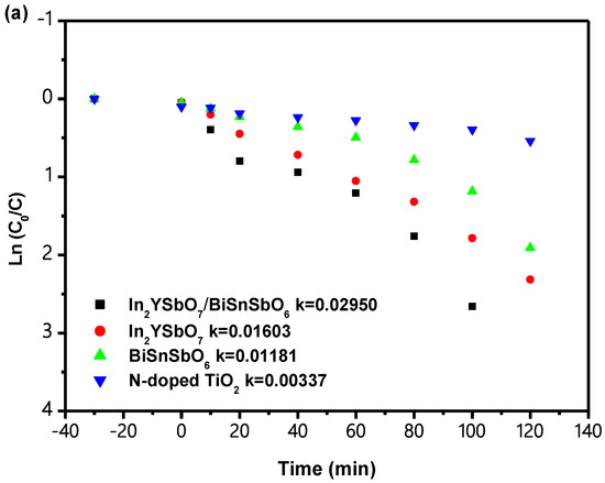 The BGE of In2YSbO7 was 2.68 eV, the BGE of Bi3O5I2 was 2.02 eV [63] and the BGE of Co-doped ZnO was 2.39 eV [64]. The BGE of every catalyst derived from the above three catalysts was less than 2.69 eV, indicating that above three photocatalysts had strong visible-light catalytic activity.