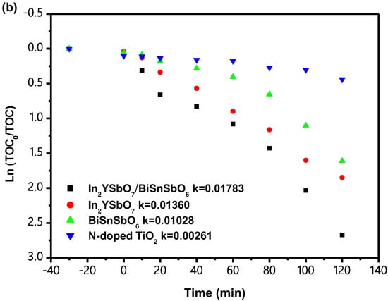 Figure 20 shows the analysis of first-order kinetic (FOK) plots for the PCD of IC with IBH as catalyst or with In2YSbO7 as a catalyst or with BiSnSbO6 as a catalyst or with N-TiO2 as a catalyst under VLGI. It can be seen from Figure 20 that the kinetic constant k (KCK), which was from the DCT IC concentration and VLGI time, with IBH, In2YSbO7, BiSnSbO6 or N-TiO2 as the catalyst, reached 0.0295 min−1, 0.01603 min−1, 0.01181 min−1 and 0.00337 min−1, respectively. The KCK which came from the DCT TOC concentration and VLGI time reached 0.0178 min−1, 0.0136 min−1, 0.0103 min−1 and 0.0026 min−1 with IBH, In2YSbO7, BiSnSbO6 or N-TiO2 as the catalyst. The KTOC value obtained during IC degradation was lower than the KC value obtained when the same catalyst was utilized to degrade IC. At the same time, compared with In2YSbO7 or BiSnSbO6 or N-TiO2, IBHP possessed the highest degradation mineralization efficiency for degrading IC.