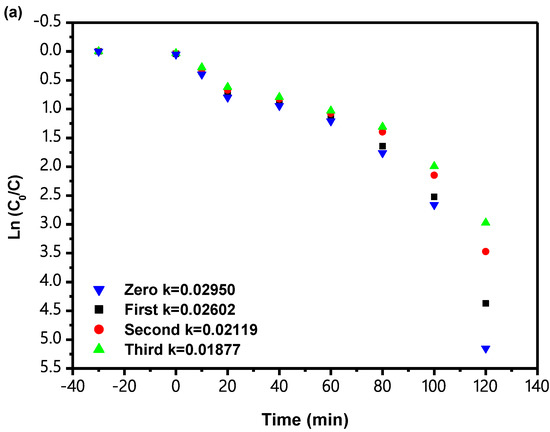 Figure 21 shows the FOK for the PCD of IC when IBH is used as a catalyst for TCDT under VLGI conditions. According to the results shown in Figure 21, the KCK derived from the DCT IC concentration and VLGI time with IBHP for TCDT achieved 0.02602 min−1, 0.02119 min−1 and 0.01877 min−1. In addition, the KCK which came from the DCT TOC concentration and VLGI time with IBH as a photocatalyst for TCDT reached 0.01717 min−1, 0.01569 min−1 and 0.01491 min−1. The results of the analysis are shown in Figure 20 and Figure 21; the PCD of IC in DW with IBH as a photocatalyst under VLGI conformed to first-order reaction kinetics.