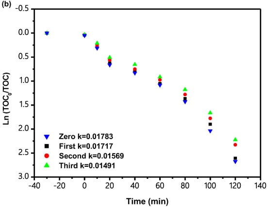 (a) Observed FOK plots for the PCD of IC with IBH as photocatalyst under VLGI for three cycle degradation tests. (b) Observed FOK plots for TOC during PCD of IC with IBH as photocatalyst under VLGI for three cycle degradation tests.