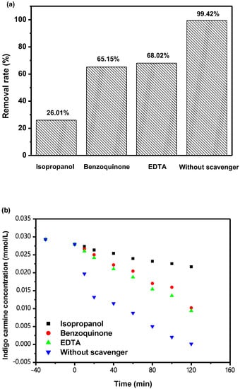 In the last few years, the water pollution problem had drawn worldwide attention. Among the number of pollutants, organic pollutants derived from dye wastewater (DW)from textile and photography industries became an acute environmental problem due to its unacceptable color, high-chemical oxygen demand, toxicity and biodegradation. Indigo carmine (IC) could be detected in dyes, and IC was widely used in food, medicine, clothing and other fields. Moreover, IC was carcinogenic in nature and could cause serious health problems in human beings, including reproduction, neurons, acute toxicity, eye or skin exposure, hypertension, cardiovascular or respiratory problems [1]. The organic pollutants from DW could be removed by coagulation–flocculation, adsorption and membrane filtration. However, because of the disadvantages of toxicity and high price [2,3], many macromolecular organic pollutants could not be biodegraded. The photocatalysis technique which possesses the strengths of environmental conservation, low cost and high treatment efficiency [4,5] is widely used in treating sewerage. From the perspective of energy, photocatalytic technology is more scientific and promising because photocatalytic technology only requires the use of sunlight for activating catalysts. [6]. Photocatalysts can effectively decompose organic pollutants because of the production of the oxidation free radicals. This is a new interdisciplinary research field. Catalysts can be regenerated and recycled, which is of great significance for the research work of photocatalysis technology in the future.