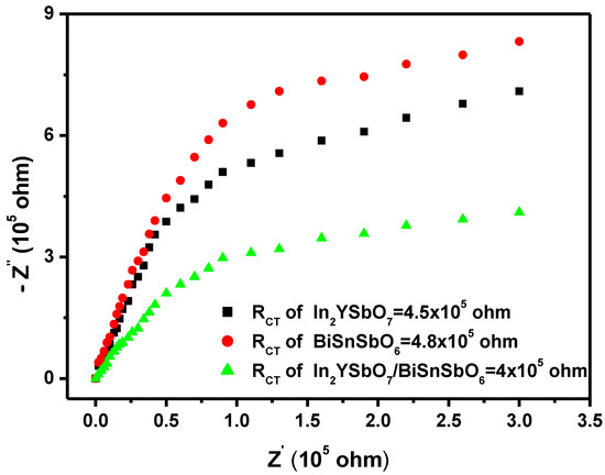 Nyquist impedance plots of IBHP or In2YSbO7 photocatalyst or BiSnSbO6 photocatalyst.