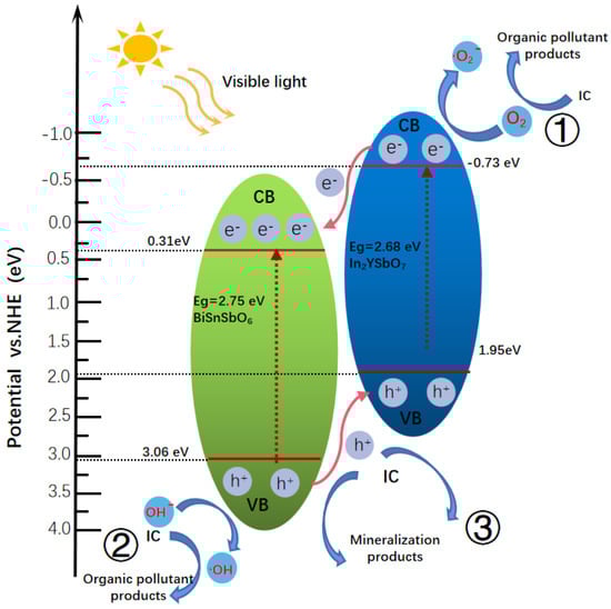 In the formulas, X is the electronegativity of the semiconductor, Ee is the energy of free electrons on the hydrogen scale and Eg is the band gap. Based on above formulas, it can be seen that the VB potential and CB potential of In2YSbO7 are about 1.95 eV and −0.73 eV, respectively. For BiSnSbO6, the VB potential and CB potential are about 3.06 eV and 0.31 eV, separately. It was observed that both In2YSbO7 and BiSnSbO6 could absorb visible light; simultaneously, PE and PH could be generated when the IBHP was under the condition of VLGI. Due to the fact that the redox potential position of CB for In2YSbO7 (−0.73 eV) was more negative than that of BiSnSbO6 (0.31 eV), the PE on the CB of In2YSbO7 was diverted to the CB of BiSnSbO6. Moreover, the redox potential position of VB for BiSnSbO6 (3.06 eV) was more positive than that of In2YSbO7 (1.95 eV), so the PH on the VB of BiSnSbO6 was transferred to the VB of In2YSbO7. Therefore, IBHP produced by the coupling of In2YSbO7 and BiSnSbO6 can efficiently decrease the recombination rate of PE and PH, thereby reducing the internal resistance, extending the lifetime of the PE and the PH; as a result, the interfacial charge metastasis efficiency is improved [66]. In addition, the CB potential of In2YSbO7 was −0.73 eV, which was more nonpositive than that of O2/•O2− (−0.33 V), demonstrating that the electrons in the CB of In2YSbO7 could assimilate subaqueous soluble oxygen for producing •O2−, which coan degrade IC efficiently, as shown in Path 1. Meanwhile, the VB potential of BiSnSbO6 was 3.06 eV, which was more nonnegative than OH−/•OH (2.38 V), illustrating that the PH in the VB of BiSnSbO6 could oxidize H2O or OH− into •OH, which can degrade IC effectively; this is displayed in Path 2. The PH in the VB of In2YSbO7 or BiSnSbO6 could immediately oxidize IC for degradation of IC due to their powerful oxidizing capability, as shown in Path 3. To sum up, the excellent photocatalytic activity of IBHP toward IC degradation is mainly attributed to the higher separation efficiency of the PE and the PH, which was induced by IBHP.
