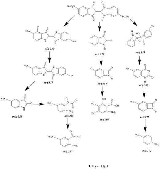 In order to research the degradation mechanism of IC, LC–MS was used to analyze the intermediate products during the IC degradation process. The intermediate products were isatin (m/z = 219), 5′,6′-dihydroxy-3,3′-dioxo-[2,2′-biindolinylidene]-5-sulfonic acid (m/z = 375), diethyl oxalate (m/z = 146), ethyl oxamate (m/z = 117), 4-hydroxy-3,3′-dioxo-[2,2′-biindolinylidene]-5,5′-disulfonic acid (m/z = 439), C8H4NO6S (m/z = 242), 2,3-dioxoindoline-5-sulfonic acid (m/z = 228), 2-(2-amino-5-sulfophenyl)-2-oxoacetic acid (m/z = 246), 2-amino-5-sulfobenzoic acid (m/z = 217), 6-amino-2,3,4-trihydroxybenzoic acid (m/z = 186), oxalic acid, aniline and acetic acid. The analysis of detected intermediate products showed possible PCD paths of the IC. Figure 25 shows a possible PCD pathway scheme with IBHP for IC degradation under the condition of VLGI. As shown in Figure 25, the hydroxylation reaction, oxidation reaction, methylation reaction, decarboxylation reaction and desulfonation reaction were achieved.