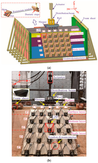 In recent years, with the rapid development trends of passenger and freight transportation expansion, the current railways in operation cannot match this increasing demand, and faster and heavier trains would be the most direct and effective way to meet these challenges. However, increasing train speeds and axle loads can inevitably lead to an increase in the load frequencies and magnitudes acting on the railway subgrade and accelerate the micro-structural damage of the subgrade. Consequently, a series of possible railroad subgrade diseases, such as unacceptable settlement, subgrade slope instability, cracking in the shoulder section, and ballast pockets would develop and seriously hamper the operational safety and efficiency of existing railways [1,2]. These diseases are closely related to a poor stress state of the subgrade soil and a lack of lateral deformation constraint of the subgrade slope. To this end, a set of newly-developed prestressed reinforcement structure (PRS) consisting of two lateral pressure plates (LPP) and a pretension tendon protected by a sleeve tube was proposed by Leng [3] to strengthen railway subgrade, as shown in Figure 1. Compared with the conventional reinforcement methods for railway subgrades [4], this new structure can not only supplement additional confining pressure for subgrade soil, but also provide lateral deformation constraints for subgrade slope without blocking or disturbing the normal traffic operation.