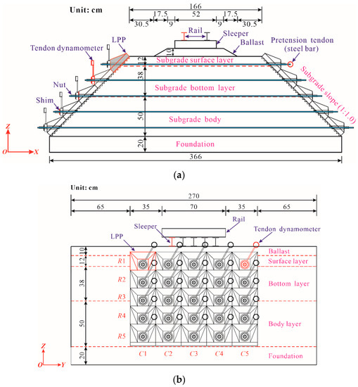 The laboratory model test systems are composed of different parts, as shown in Figure 2. To construct the subgrade and install the PRS conveniently, a large-scale U-shaped rigid model box with internal net dimensions of 2.9 m long, 3.86 m wide, and 1.6 m high to reduce the box effect [39], whose natural frequency is far from that of the subgrade soil, was manufactured using the No. 16 channel beam. To further reduce or avoid the dynamic boundary effect induced by the model box on the subgrade, 10 cm-thick polystyrene foam sheets were laid along the bottom and around the inner wall of the model box. For the subgrade part, the subgrade slope gradient was adjusted from the conventional 1:1.5 to 1:1.0 to better exhibit the advantages of PRS, and a standard single-line heavy haul railway embankment prototype in accordance with the Chinese Code for Design of Heavy Haul Railway (TB 10625-2017) [40] was adopted to design the structural geometry dimensions of the subgrade model. Specifically, the subgrade top and the cross-section of the foundation were 1.66 m and 3.66 m wide, respectively; the thicknesses of the ballast layer, the subgrade bed layer, the body layer, and the foundation were 0.1 m, 0.5 m, 0.5 m, and 0.2 m, respectively; the longitudinal length of the subgrade was 2.7 m. The cross-sectional and longitudinal layouts and detailed dimensions are presented in Figure 3, in which the x-axis denotes the horizontal direction of the subgrade cross-section, the y-axis represents the longitudinal direction of the line, and the z-axis is the vertical direction. Additionally, in Figure 2 and Figure 3, the Ri is the ith row of the LPPs, while Ci is the ith column of the LPPs.