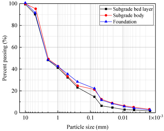 To simulate the natural ground condition, a foundation layer 0.2 m thick was constructed at the model bottom, on which the subgrade, consisting of a subgrade bed and body layers, was laid, and the entire model was constructed by layer. For the fillers in the model, machine-made sand and two low-liquid-limit clays were mixed at different mass ratios to prepare the fillers for these three layers. According to the soil classification system provided by the Chinese Code for Design of Railway Earth Structure (TB 10001-2016) [41], the filler for the subgrade bed layer can be classified as a well-graded fine breccia with the soil of Group A2, and two other different fine breccia soils of Group B3 were constructed for the subgrade body and foundation layers, respectively. The particle size distributions of these three fillers are plotted in Figure 4. The basic physical properties of the fillers are listed in Table 2.