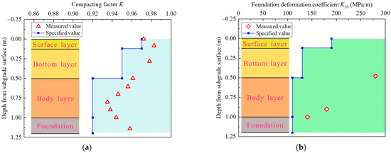 Detection results of compaction quality of subgrade and foundation. (a) Compacting factor K; (b) foundation deformation coefficient K30.