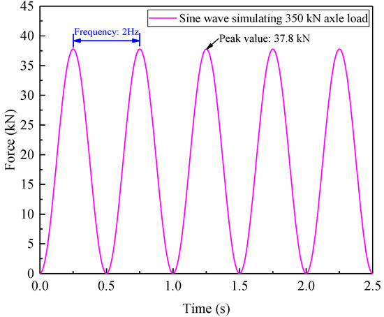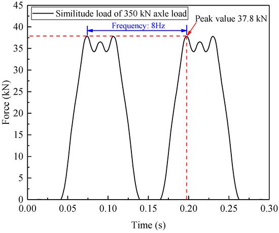 In this model test, five sleepers were designed to share the dynamic loads acting on the rails. This is because moving train loads applied on rails are generally undertaken by approximately five sleepers (fasteners) [47,48], and the time-varying loads at each sleeper could be calculated based on the prototype track structure dimensions and related similitude relations. Due to the limitation of only one actuator in the experimental loading facility, a resultant load by superposing these five loading histories with the consideration of the time phase lag (Δt = a/v) between adjacent sleepers was applied on the distribution beam. An example of the M-shaped load-time history, which was derived from a freight wagon with a 350 kN axle load traveling at 80 km/h based on the above-mentioned approach, is illustrated in Figure 7, where the peak load was 37.8 kN and the loading frequency was 8 Hz.