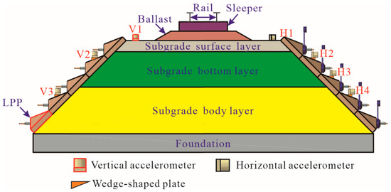The acceleration responses of the prestressed subgrade were measured using an 891-Ⅱ accelerometer with a sensitivity of 100 mV/m/s2, developed by the Institute of Engineering Mechanics, China Earthquake Administration, Harbin, China. During the test, the middle column (C3) of the LPPs was selected as the measurement section, where three vertical (points V1, V2, and V3) and four horizontal (points H1, H2, H3, and H4) accelerometers were arranged, as shown in Figure 8. Except for the accelerometers installed at points V1 and H1, which were close to the shoulder on the subgrade surface, they were all positioned on the corresponding LPP surfaces at each side of the subgrade slope using wedge-shaped plates, which were glued onto the LPP surface.