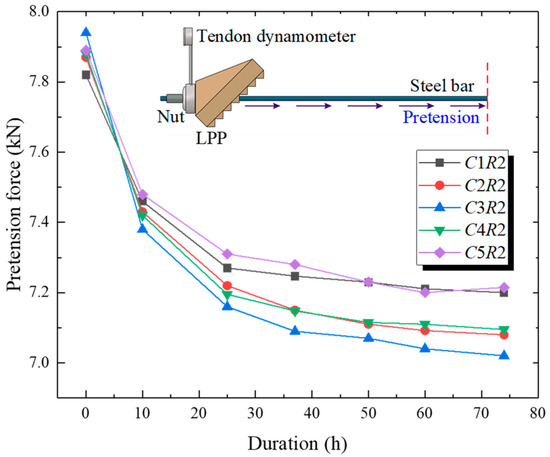 The level of the pretension force of the steel bar (or reinforcement pressure provided by the PRS) is a crucial control factor for a prestressed subgrade, which plays a decisive role in the effectiveness of the PRS. Prior to the implementation of the dynamic loading tests, a preliminary test regarding the evolution of the pretension force of each steel bar was performed by taking the R1 = 50 kPa, R2 = R3 = R4 = R5 = 100 kPa (i.e., reinforcement case of 100 kPa) as the typical study, with a duration of 74 h after installation of the PRS, briefly capturing the static variation characteristics of the prestress loss. As the pretension forces of each row were anchored, they could be equivalently transformed to the initial reinforcement pressures applied on the subgrade slopes for each row of the PRS. Figure 9 shows the variation in the pretension force over time at the R2 row. It was found that the pretension force of each bar had a decreasing tendency over time and the loss magnitudes in sequence were as follows: C3R2 (0.92 kN) > C4R2 (0.86 kN) > C2R2 (0.79 kN) > C5R2 (0.68 kN) > C1R2 (0.62 kN). Meanwhile, the attenuation of the pretension force tended mostly to be marginal after 74 h. These observations were largely owing to the soil creep behavior caused by additional stress and the group anchor effect with a nonuniform distribution of additional stress.