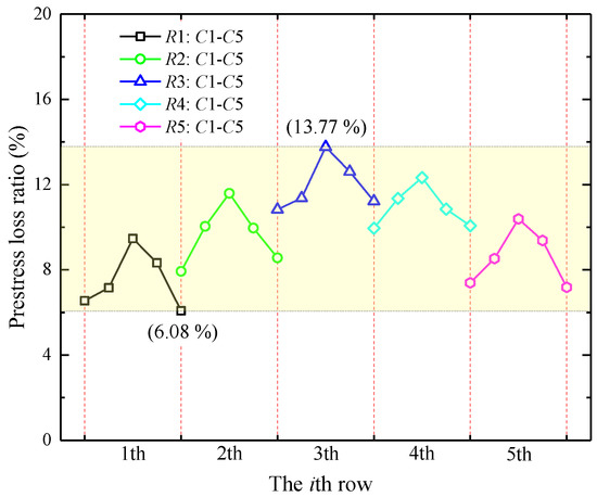 The average prestress loss ratios of the steel bars for each row are illustrated in Figure 10. It can be observed that the prestress loss ranged from 6.08% to 13.77% corresponding to the borders of the yellow rectangular, and each row of prestress losses showed an inverted “V” distribution from the C1 to the C5 column separating with the red dash line, with the largest and least prestress losses of the steel bars occurring at the middle column (i.e., column C3) and both ends (i.e., column C1 or C5), respectively, which possibly resulted from the distribution characteristics of the additional stress provided by the PRS. In addition, judging from each row, the average prestress loss ratios were as follows: R3 (11.96%) > R4 (10.91%) > R2 (9.62%) > R5 (8.57%) > R1 (7.52%). These findings imply that in practical engineering, it is necessary to provide an over-tension treatment for the steel bars during the tension of the steel bars. Indeed, further investigation into the prestress loss perhaps caused by soil creep, the moving train load, and the climate environment is necessary.