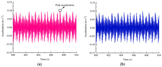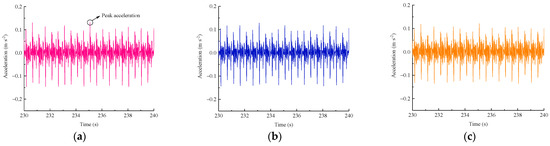 Vertical acceleration–time histories. (a) Point V1; (b) Point V2; (c) Point V3.