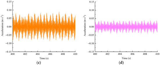 Horizontal acceleration–time histories. (a) Point H1; (b) Point H2; (c) Point H3; (d) Point H4.