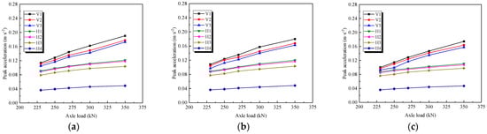 Relationship between peak acceleration and axle load at different reinforcement pressures. (a) Reinforced pressure 0 kPa; (b) Reinforced pressure 50 kPa; (c) Reinforced pressure 100 kPa.