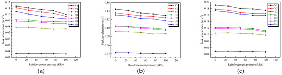 Variations in peak accelerations with reinforcement pressures under different axle loads. (a) 230 kN axle load; (b) 270 kN axle load; (c) 350 kN axle load.