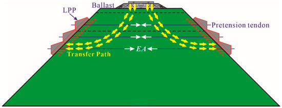 Based on all the short-term experimental results, the reinforcement mechanism of prestressed subgrade can be deduced as follows: as the train passes, the vertical and lateral deformations were generated on the subgrade top surface and slope, respectively. Meanwhile, with the help of the PRS in the prestressed subgrade, the slope lateral deformation was restricted because the LPPs placed on both sides of the slope are tensioned by a steel tendon with pretension. Specifically, since Young’s modulus of the steel tendon is greatly higher than that of the subgrade soil, a PRS with high tensile rigidity (EA) together with the subgrade soil itself could resist the lateral deformation and share the outward lateral thrust force induced by the upper dynamic load when subjected to moving train loads, which contributes to an improvement in the lateral deformation resistance for subgrade. The reinforcement principle of prestressed subgrade is demonstrated in Figure 15, where the red arrows refer to the reinforcement pressure, the yellow arrows represent the loading transfer path, and the white arrows show the tensile resistance effect of steel bars. In addition, given that the subgrade could be regarded as a deformation continuum medium, once the development of the slope lateral deformation is partly inhibited by the PRS, the subgrade settlement would also be reduced accordingly. On the other hand, it is clear that the vertical strain development of the soil unit would be limited when its lateral pressures in the horizontal direction are raised, which is in accordance with the generalized Hooke’s law. That is, improving the confining pressure of the subgrade could decrease the vertical deformation and also weaken the vibration response in the prestressed subgrade. These descriptions above could reveal the mechanical principle and working advantages of prestressed subgrade well.