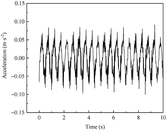 Figure 11 shows the variation in the vertical acceleration over time during the stable loading phase in the case of an axle load of 270 kN and reinforcement pressure of 50 kPa, indicating that the accelerometer can accurately record the repetition process of loading–unloading excited by the actuator. In addition, it is apparent that at the time instant of reaching the peak load, the acceleration at each measuring point also rapidly increased to the peak level and were subsequently accompanied by some fluctuations. The acceleration histories are basically symmetrical with respect to the baseline of 0 m/s2. A distinct periodicity with a time interval of 0.5 s can be found in these recorded responses. The average values of the peak accelerations gradually decreased along the slope from the shoulder to the toe in a descending sequence, as follows: 0.1353 m/s2 (V1) > 0.1284 m/s2 (V2) > 0.1220 m/s2 (V3). This is mainly attributed to the material damping and diffusion effect of the dynamic loads, resulting in a gradual attenuation of vibration downward along the subgrade slope.