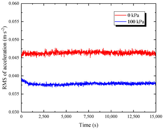 The peak acceleration refers to the maximum vibration response of the subgrade, which corresponds to the worst conditions at the time instant, but it is unsuitable to directly evaluate the long-term vibration. Here, a total loading time length of 15,000 s was needed for each of the test cases, as shown in Figure 17, and the real vibration effect would be evaluated inaccurately if all the peak accelerations in each loading cycle were considered alone. Thus, the calculation of the running root mean square root (RMS) value with respect to the acceleration–time history was used as an effective evaluation method to obtain the acceleration characteristics in the time domain more reasonably, as given by [23]: