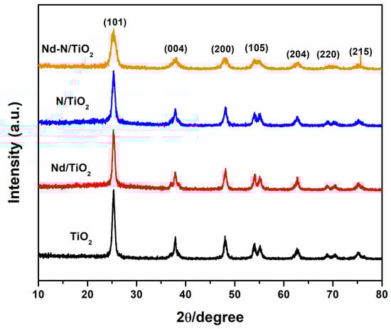 High rates of industrialization, urbanization and overpopulation result in the production of wastewater on a large scale. Wastewater contains various toxic and harmful substances which are clear threats to human life and the environment [1]. Specially, wastewater contaminants including organic dyes, drugs, pigments, hydrocarbons, etc., are creating permanent damage to ecosystems and the environment [2]. Therefore, wastewater recycling for various objectives requires viable, clean and sustainable technologies for the degradation of toxic water contaminants [3]. For this purpose, the most effective approach is to design an adoptable photocatalyst to decompose the pre-existing environmental pollutants. Heterogeneous photocatalysts such as TiO2, ZnO, Fe2O3, CdS, SnO2, V2O5, g-c3N4, etc., have been found to effectively photodecompose many harmful and toxic organic pollutants of wastewater [4,5,6,7]. Titanium dioxide has been commonly used in heterogeneous photocatalysis owing to its extraordinary characteristics, namely its low cost, strong oxidizing power and stability in aqueous environments [8]. However, intrinsic TiO2 suffers from the lower absorption of visible light, attributable to its broader band gap (~3 eV) and limited photocatalysis activity due to the prompt reunion of charges (electrons and holes) [9,10]. A wide variety of doping techniques have been employed to solve these problems, including doping with transition and noble metals, non-metallic ions and rare earth metals [11,12,13,14,15,16,17]. In particular, the doping of non-metallic ions into TiO2 is very easy and is the most active method to achieve solar light absorption in the visible range and higher photocatalysis. It was previously observed that N doping into TiO2 systems develops N 2p energy states above the valence band edge of TiO2, thus decreasing its band gap and enhancing light utilization in the visible range [18]. Additionally, N doping also reduces the reunion of charges in the N-TiO2 system for the better performance of TiO2 as a photocatalyst. However, N-TiO2 photocatalyst efficiency is still limited because of the low lifetime of the photogenerated charges during photocatalysis. Therefore, doping rare earth metals into TiO2 is also a useful method to advance its photocatalysis efficiency through the reduction in the charge carriers’ recombination [19]. Compared with other rare earth metals, Nd is an efficient element that has gained attention in many studies due to its good properties [20,21]. Nd-doped TiO2 has the ability to reduce band gaps and overcome the reunion of charges for enhanced photocatalytic activity [22,23,24]. To the best of our knowledge, no report can be found in the literature on Nd and N co-doped TiO2 nanomaterials for photocatalytic applications. Therefore, the development of Nd-N/TiO2 photocatalytic systems will be a good strategy to achieve a higher decolorization of organic contaminants under visible-light exposure.