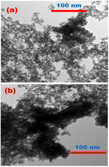 TEM studies are useful for identifying the size and shape of nanomaterials. Figure 2a,b illustrate TEM images of the TiO2 and Nd-N/TiO2 nanomaterials, respectively. The particles in both materials were nearly spherical and were uniformly separated without any distinguishable agglomeration. The average particle size for both materials was less than 20 nm. Furthermore, in the Nd-N/TiO2 sample, the black Nd was homogeneously dispersed on the TiO2 surface, showing the more defective nature of the Nd-N/TiO2 sample.