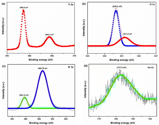 The electronic structure and chemical states of Nd-N/TiO2 were studied using XPS. Figure 3 shows the Nd-N/TiO2 sample’s XPS spectra of Ti 2p, O 1s, N 1s and Nd 4d. The stronger peaks, namely, Ti 2p3/2 and Ti 2p1/2, appeared at 458.6 eV and 464.4 eV, respectively (Figure 3a), signifying that titanium metal (Ti) existed as Ti4+ [26,27]. As revealed in Figure 3b, the spectrum of O 1s can be fitted into peaks. The appearance of peak at 530.0 eV shows an oxygen atom’s existence in the TiO2 lattice (Ti-O bond) and the second peak at 531.6 verifies the presence of a surface hydroxyl oxygen [28]. In a highly resolved spectrum of N 1s, as shown in Figure 3d, the first peak at 395.75 eV can be attributed to Ti-N bonds, which confirm that the doping of N into the TiO2 material was substitutional [29]. The other peak at 399.79 verifies the interstitial N doping in the TiO2 nanoparticles (Ti-O-N) [30]. In the Nd 4d spectrum (Figure 3d), the single peak appearing at 121.5 eV shows a positive shift of 3.5 eV from the metallic Nd° (118). This positive shift suggests that the Nd dopant was present in the TiO2 nanoparticles as Nd3+ ions [31,32,33].