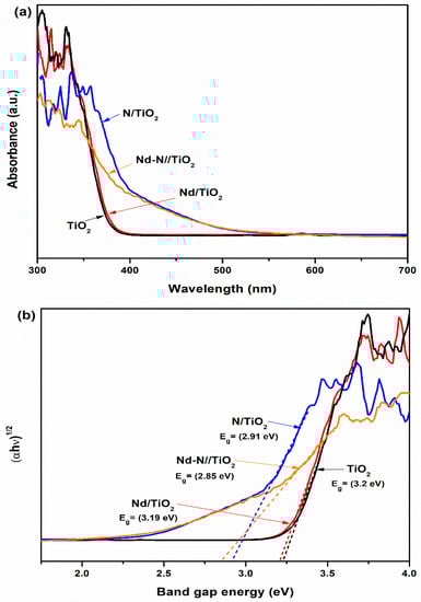 Figure 4a shows the absorption spectra of the pristine TiO2, Nd/TiO2, N/TiO2 and Nd-N/TiO2 samples. The band gap energy (Eg) of all the samples can be calculated using the equation:
