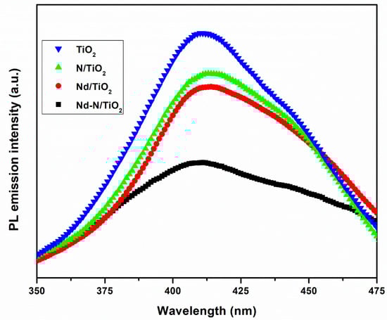 PL spectroscopy has been extensively utilized to determine the charge carriers’ trapping efficiency, immigration and transportation to know the destiny of the charges in semiconducting nanomaterials [26]. Figure 5 represents the PL spectra of the TiO2, N/TiO2, Nd-N/TiO2 and Nd-N/TiO2 nanoparticles. As displayed in the results, the pristine TiO2 had a large PL intensity, whereas, after the incorporation of Nd and N, the PL intensity decreased, displaying a suppressed reunion of the electron/hole. Most interestingly, the co-doped Nd-N/TiO2 sample exhibited the lowest PL intensity compared to all the other samples. This is clear evidence that the Nd and N co-doping had a significant influence on separating the charge carriers in TiO2 in order to boost photocatalytic performance for dye degradation.
