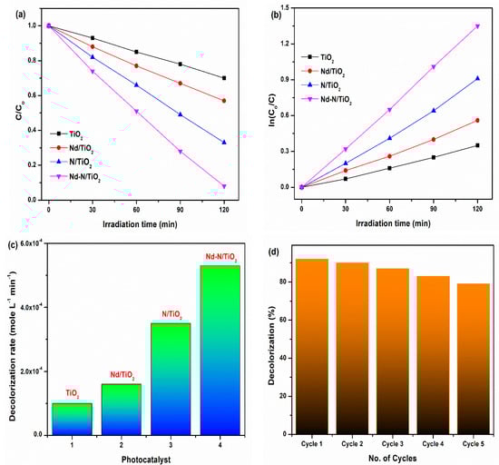 Here, ‘k’ denotes the rate constant, C represents the dye concentration, while n represents the reaction’s order. Figure 6c shows the degradation rate, which followed the order TiO2 (1.0 × 10−4) < Nd/TiO2 (1.6 × 10−4) < N/TiO2 (3.5 × 10−4) < Nd-N/TiO2 (5.3 × 10−4). The superior photocatalysis efficiency of the Nd-N/TiO2 photocatalyst was due to broadening the absorption of solar light and the reduced reunion of the electron/hole, as was confirmed in the UV–vis and PL spectroscopies (Figure 5 and Figure 6).