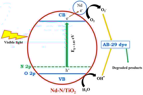 Figure 6d demonstrates the photocatalytic decomposition of the AB-29 dye over the TiO2, Nd/TiO2, N/TiO2 and Nd-N/TiO2 nanoparticles over five consecutive cycles. The decrease in the decolorization efficiencies of TiO2, Nd/TiO2, N/TiO2 and Nd-N/TiO2 after five cycles was 17%, 18%, 15% and 15%, respectively. This verifies the good stability of the prepared photocatalyst (Nd-N/TO2) along with its superior photocatalytic activity. Moreover, the excellent photocatalytic activity of Nd-N/TO2 can be understood as indicated in the mechanistic diagram (Figure 7). It is known that rare earth elements were unable to replace Ti4+ in the crystal matrix because of their incompatible ionic radii; therefore, rare earth metal ions could exist in the form of rare earth metal oxides and they could be dispersed on the surface of TiO2 [37]. Additionally, rare earth metal ions could act as a trapping site, which would efficiently reduce the recombination of the photogenerated charge carriers and then a higher photocatalytic performance could be achieved [28]. Therefore, based on these facts, Nd-N/TiO2 (2.85 eV) absorbed visible light photons and, as a result, a higher number of electrons were transported from the valence band to the conduction band of Nd-N/TiO2 via Nd3+ capturing the sites below the conduction band of the material and participating in the reduction process to produce superoxide radicals (•O2−). At the same time, the holes left behind in the valence band reacted with water to generate hydroxyl radicals (OH•). These photogenerated radicals (superoxide and hydroxyl) finally participated in the decomposition of the AB-29 dye when exposed to solar light. Furthermore, as presented in Figure 7, the Nd dopant had the capability to capture electrons from the conduction band of Nd-N/TiO2, reducing the reunion of the charges. Thus, in this way, the Nd dopant contributed to enhancing the photocatalytic efficiency of the prepared photocatalyst.