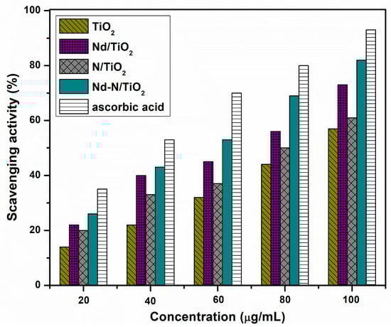 The scavenging action of all the samples was assessed via a DPPH test. It is well known that DPPH can be easily converted to a DPPH-H compound (stable) when it accepts H2 radicals from the tested nanomaterials [24]. During this process, its color changes from violet (dark) to a dim yellow. Therefore, DPPH reduction gives an estimation of the radical trapping of the tested material. Figure 8 shows the scavenging activity (%) of TiO2, N/TiO2, Nd-N/TiO2 and Nd-N/TiO2 for the DPPH assay. The scavenging performance increases with an increasing concentration of the antioxidant. The activity was boosted in the following order: ascorbic acid (35–93%) > Nd-N/TiO2 (26–82%) > Nd/TiO2 (22–73%) > N/TiO2 (20–61%) > TiO2 (14–57%), with an increasing concentration from 20 to 100 µg/mL. These results show that Nd-N/TiO2 is a superior antioxidant over all other samples. In addition, the results found in this study are good compared with other workers, including plum peals mediated-TiO2 nanoparticles, which exhibited a 78% scavenging activity for DPPH at the same concentration (100 µg/mL) [38]. In another report, Hosney et al. [2] observed a 41.89% DPPH scavenging activity at 50 µg/mL when using a Ag/ZnO@Biochar nanocomposite. Rajeswari et al. [39] found a 55% antioxidant activity at 200 µg/mL for DPPH scavenging using a Pd-RGO-ZnO nanocomposite.