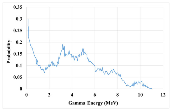 The constituent phases in each metamaterial simulation are chosen to be graphene hexagonal boron nitride (h-BN) and graphene with their ZAID defined in the data card. The neutron source used in the simulation is Americium–Beryllium (Am–Be), which has an energy range from 100 keV to 15 MeV. In Figure 3, the spectrum of this neutron source is depicted along the energy axis.