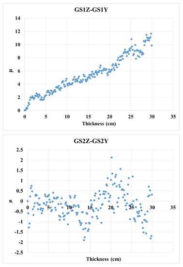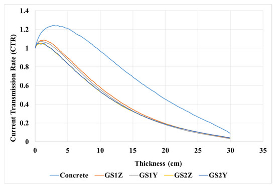 First, the CTR was evaluated for a cube target with 30 × 30 × 30 cm3 sides containing concrete and metamaterial with the GS1 and the GS2 structure. The incident beam was irradiated towards the target in two directions of z- and y-axis, the results of which are reported in Figure 4. GS1Z, GS1Y, GS2Z, and GS2Y, respectively, are the CTR obtained from GS1 per incident beam along the z-axis, the CTR obtained from GS1 per incident beam along the y-axis, the CTR obtained from GS2 per incident beam along the z-axis, and the CTR obtained from GS2 per incident beam along the y-axis.