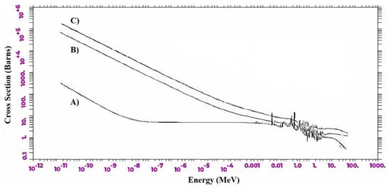 To evaluate the reason for the improvement of NRS in GS1 and GS2 compared to concrete, the cross-section of each of them was calculated and charted in the energy ranges between 10−12 and 1000 MeV. According to the results shown in Figure 8, the absorption cross-section of neutrons with energy up to 10−8 in GS1 and GS2 reach a climax (almost 100 times), which is a very impressive result and can be attributed to the boron element, which has a highly remarkable neutron absorption cross-section. Furthermore, the cross-sectional area of collision in energy ranges beyond 10−8 also has a significant growth. Therefore, the neutrons in the GS1 and GS2 structures first moderate the fast neutrons with a more acceptable scattering cross-section than concrete and then absorb thermal neutrons.