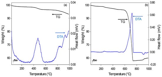 Figure 1 illustrates the differential thermal (DTA) and thermogravimetric (TGA) analyses of the porogenic agents. It should be noted that the RHA (Figure 1a) presented an endothermic event at approximately 100 °C, which was associated with a mass loss of 1% due to residual moisture, and an exothermic peak at 450 °C, which was associated with a 2% mass loss related to the release of volatile substances. One of these substances is phosphorus oxide, which is present in RHA, as demonstrated in the results from the chemical analysis [39,40]. Later, two other exothermic events were observed at approximately 800 and 900 °C, respectively. In the same region, it was possible to observe a mass loss of 4% associated with residual carbon decomposition into CO2.
