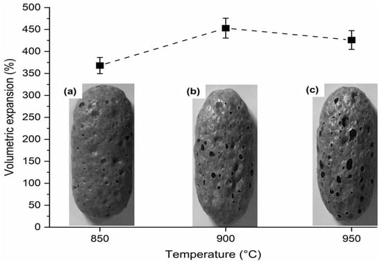 Geometric shape and volumetric expansion of the glass foams sintered at (a) 850 °C, (b) 900 °C and (c) 950 °C.