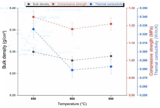 Figure 6 shows the results for the glass foams regarding apparent density (0.30 ± 0.009, 0.28 ± 0.009, and 0.29 ± 0.009 g/cm3), compressive strength (1.25 ± 0.03, 1.18 ± 0.03, and 1.21 ± 0.03 MPa), and thermal conductivity (0.326 ± 0.009, 0.279 ± 0.009, and 0.283 ± 0.009 W/mK) in relation to temperature (850, 900 and 950 °C), respectively. Figure 7 shows the results for porosity (82 ± 4, 87 ± 4, and 86 ± 4%) in relation to temperature (850, 900 and 950 °C), respectively. The results found for porosity, compressive strength, thermal conductivity, and apparent density are within the limits of those found for commercial glass foams according to the literature: porosity (85–95 ± 4%); compressive strength (0.4–6.0 MPa) [51]; thermal conductivity (0.005–0.008 W/mK) [52]; and apparent density (0.1–0.3 g/cm3) [53,54]. In addition to these properties, the material has the potential to be used as a wall coating, improving thermal comfort in the construction sector [48].