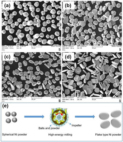 Scanning electron microscopy images of (a) pristine Ni powder; Ni powder milled for 30 min at a rotation speed of (b) 500 rpm, (c) 700 rpm, (d) 1000 rpm, and (e) the schematic illustration of the synthesis of the flake-type Ni powder.