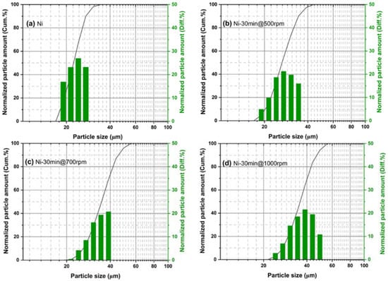 The particle size distribution of (a) pristine Ni powder and as-milled Ni powder for 30 min at (b) 500 rpm, (c) 700 rpm, and (d) 1000 rpm.