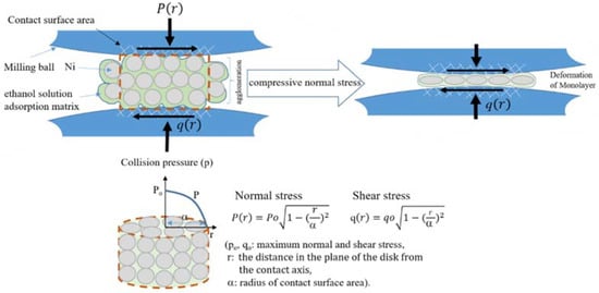 Schematic diagram showing the stress transfer over hypothetical Ni-powder agglomeration between the collision balls based on the modified Hertzian mechanics.