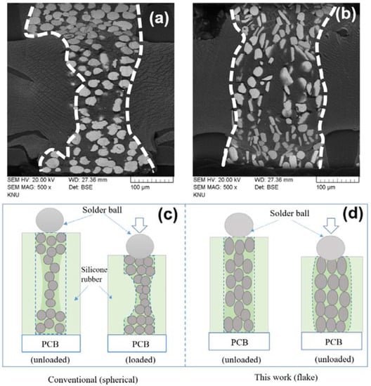 Cross-sectional SEM images of the socket channel shape change according to the compressive force of the solder ball. Socket devices with (a) spherical Ni powder, (b) flake Ni powder, (c,d) are schematic illustrations of the socket device channel deflections.