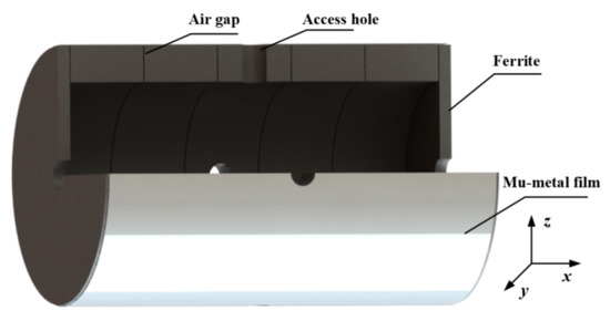 As observed in the previous research, the practical application of a ferrite magnetic shield presents several challenges. In lieu of being integrally created, numerous magnetic annuli are spliced together to produce the ferrite magnetic shield to meet the requirements of a large-scale magnetic shielding system and limit the influence of magnetic noise [22,23]. Due to the surface roughness and non-uniformity of the magnetic annuli, there will be an air gap, approximately 0.1–0.5 mm, in the ferrite shield when magnetic annuli are spliced [22]. The air gap between magnetic annuli diminishes the shielding coefficient and increases the radial magnetic noise. The shielding coefficient of ferrite magnetic shielding deteriorates. This decreases the environmental magnetic noise reduction and increases self-induced magnetic noise. Its effectiveness is impacted by the superposition of the two forms of magnetic noise. The research on the air gap of ferrite magnetic annuli focuses solely on its effect on the shielding coefficient and magnetic noise. There is currently no solution for the air gap. The air gap cannot be eliminated by finishing the contact surface of magnetic annuli.