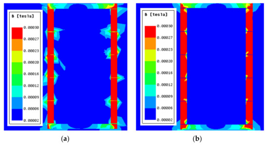 A Ferrite magnetic shield is difficult to manufacture and process, especially when a large size is required. For this reason, a cylindrical ferrite shield is usually made of several short ferrite annuli pasted with ceramic adhesive. The thickness of the ceramic adhesive and the unevenness of the contact surface led to air gaps [23]. The air gap between magnetic annuli causes magnetic leakage. The cloud diagram of magnetic flux density when the air gap width was 0.5 mm is shown in Figure 3a, and Figure 3b demonstrates that the FMCS structure effectively prevented magnetic leakage at the air gap of the ferrite magnetic shield. The thickness of mu-metal film used for simulation was 0.5 mm.